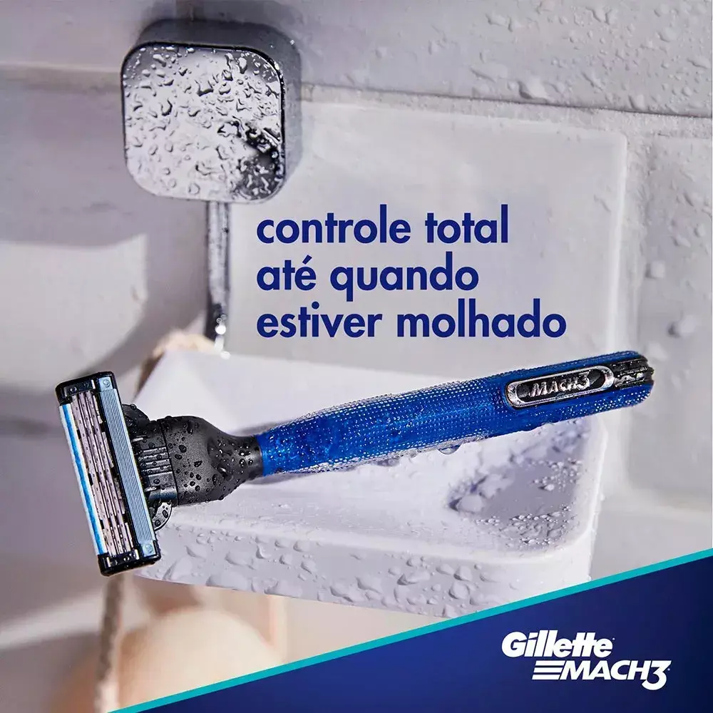 O barbeador Gillette Mach3 agora com um cabo 360° Aqua-Grip para controle total, mesmo úmido. Três lâminas mais afiadas que oferecem até 20 vezes um barbear suave; com uma fita lubrificante que ajuda a proteger a pele contra irritações e cabeça móvel que se ajustam aos contornos do rosto para um barbear confortável e nivelado.