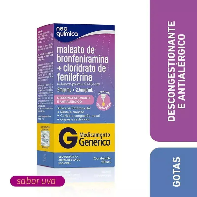 O Maleato de Bronfeniramina 2mg/mL + Cloridrato de Fenilefrina 2,5mg/mL, da Neo Química, é um medicamento genérico em solução em gotas com 20 mL, indicado para o alívio sintomático de quadros clínicos relacionados a afecções das vias aéreas superiores e manifestações alérgicas.