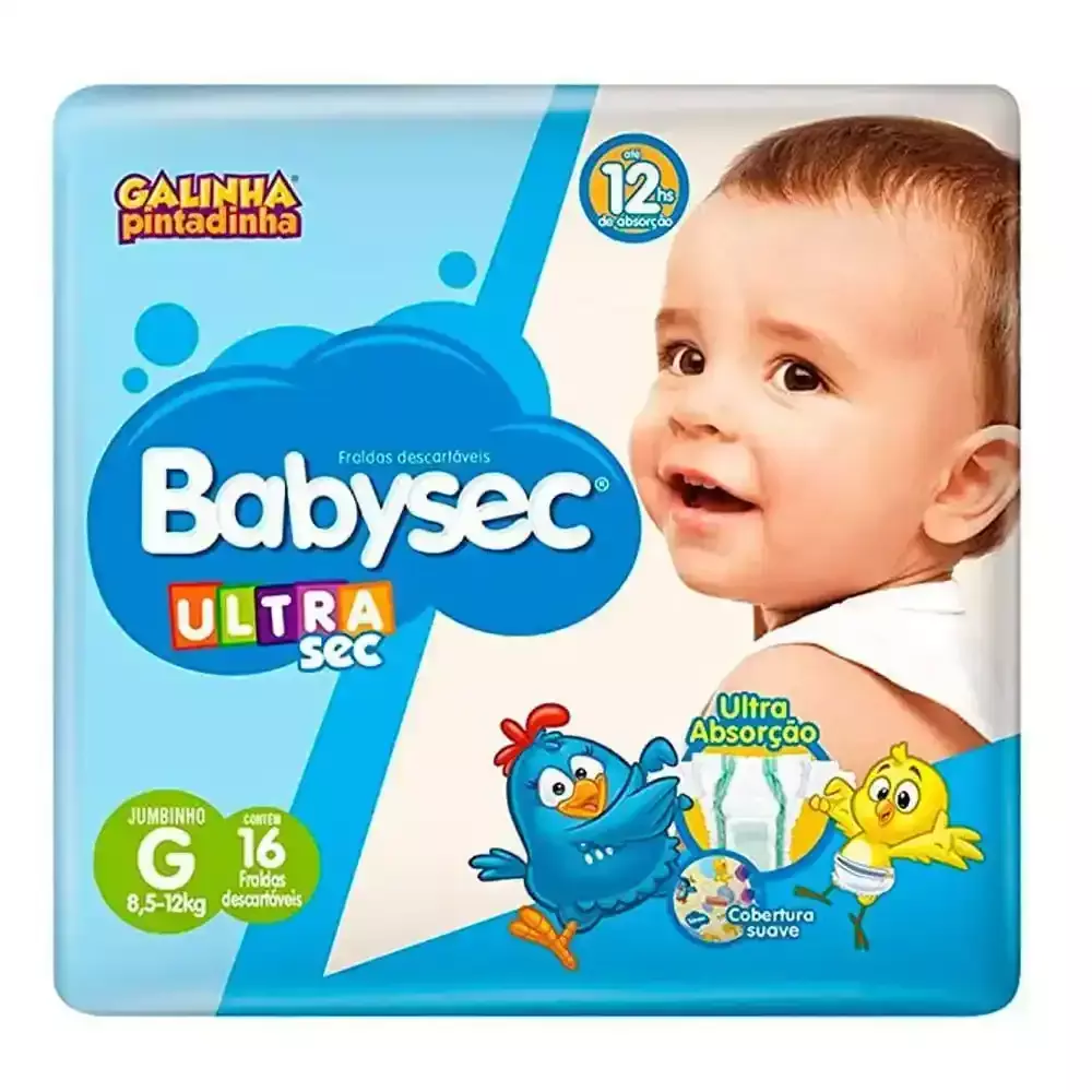 A fralda <a class="SmjhRb bqYA2d" jsuid="qSAqJ_n" role="link" tabindex="0" id="pvlink00ndaKivMNHR1sQPoeT3kAU_1" jsaction="click:&qSAqJ_m|T2P31d" data-ved="2ahUKEwjo5I--qYOQAxXRqJUCHSHyHVIQxa4PegYIAQgDEAI" href="https://www.google.com/search?prds=pvt:hg,pvo:29,mid:576462609560822732,imageDocid:12663926995841585677,gpcid:7595381613839214841,headlineOfferDocid:15369889449503124390,catalogid:2969507331494599430,productDocid:14993867914415242988,rds:PC_7595381613839214841%7CPROD_PC_7595381613839214841&ibp=oshop&q=product&sa=X&ved=2ahUKEwjo5I--qYOQAxXRqJUCHSHyHVIQxa4PegYIAQgDEAI" style="text-decoration-thickness: 8%; text-decoration-style: dotted; -webkit-tap-highlight-color: rgba(0, 0, 0, 0.1); text-underline-offset: 10%; outline: 0px;">Babysec Ultrasec Galinha Pintadinha Jumbinho G</a> com 16 unidades é projetada para bebês com mais de 13 kg, oferecendo conforto e proteção por até 12 horas.