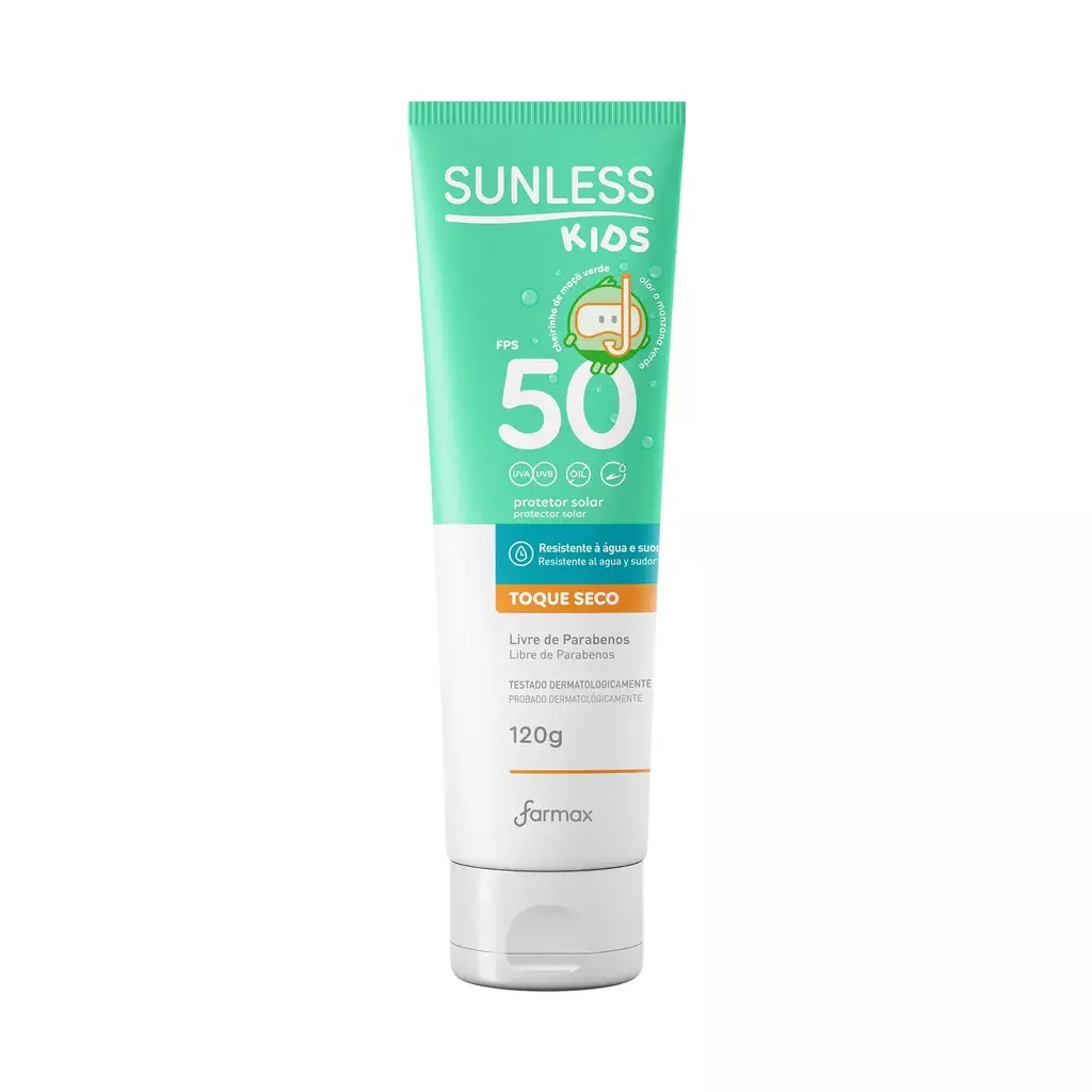 O Protetor Solar Kids FPS 50 Sunless 120g apresenta alta proteção para a pele das crianças, combatendo com eficácia a ação prejudicial dos raios UVA e UVB. Com uma fragrância suave de maçã verde, é fácil de espalhar, possui fácil absorção e mantém a pele sempre hidratada.