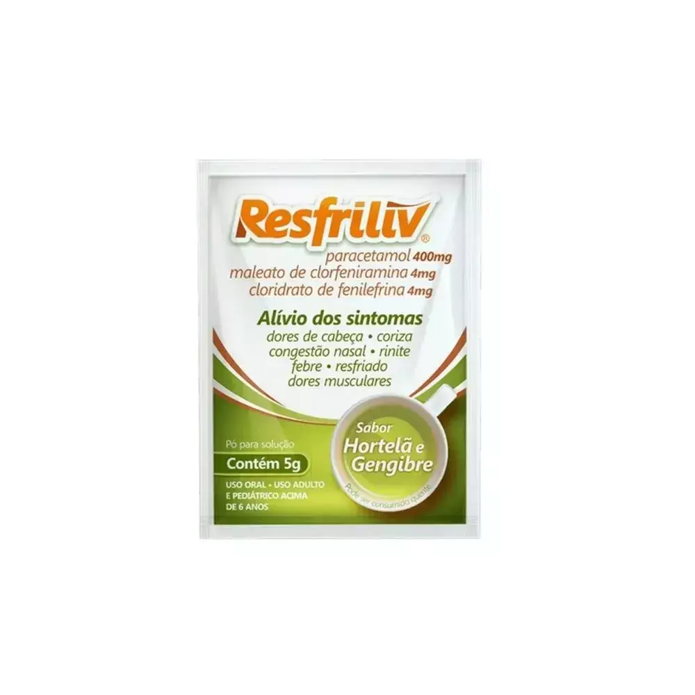 O Resfriliv Sabor Hortelã/Gengibre é um medicamento antigripal, na forma de pó para solução oral, indicado para o alívio dos sintomas de gripes e resfriados. Cada envelope contém 5 gramas do produto e sua fórmula combina substâncias analgésicas, antitérmicas e anti-histamínicas.