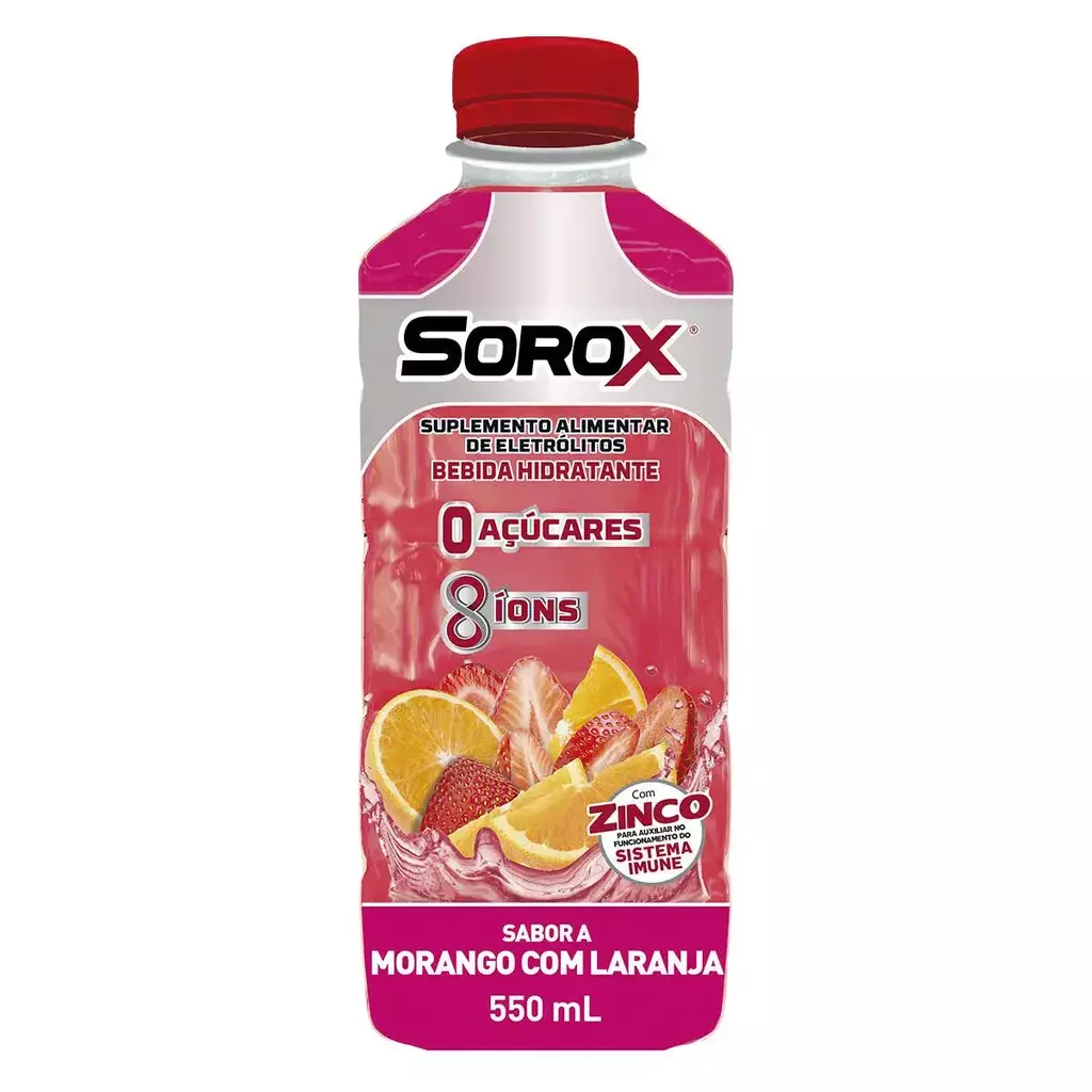 Sorox Morango com Laranja é uma bebida hidratante com eletrólitos, formulada para auxiliar na recuperação de minerais perdidos pelo corpo. É uma alternativa aos isotônicos tradicionais, sendo zero açúcar e com baixo valor calórico.